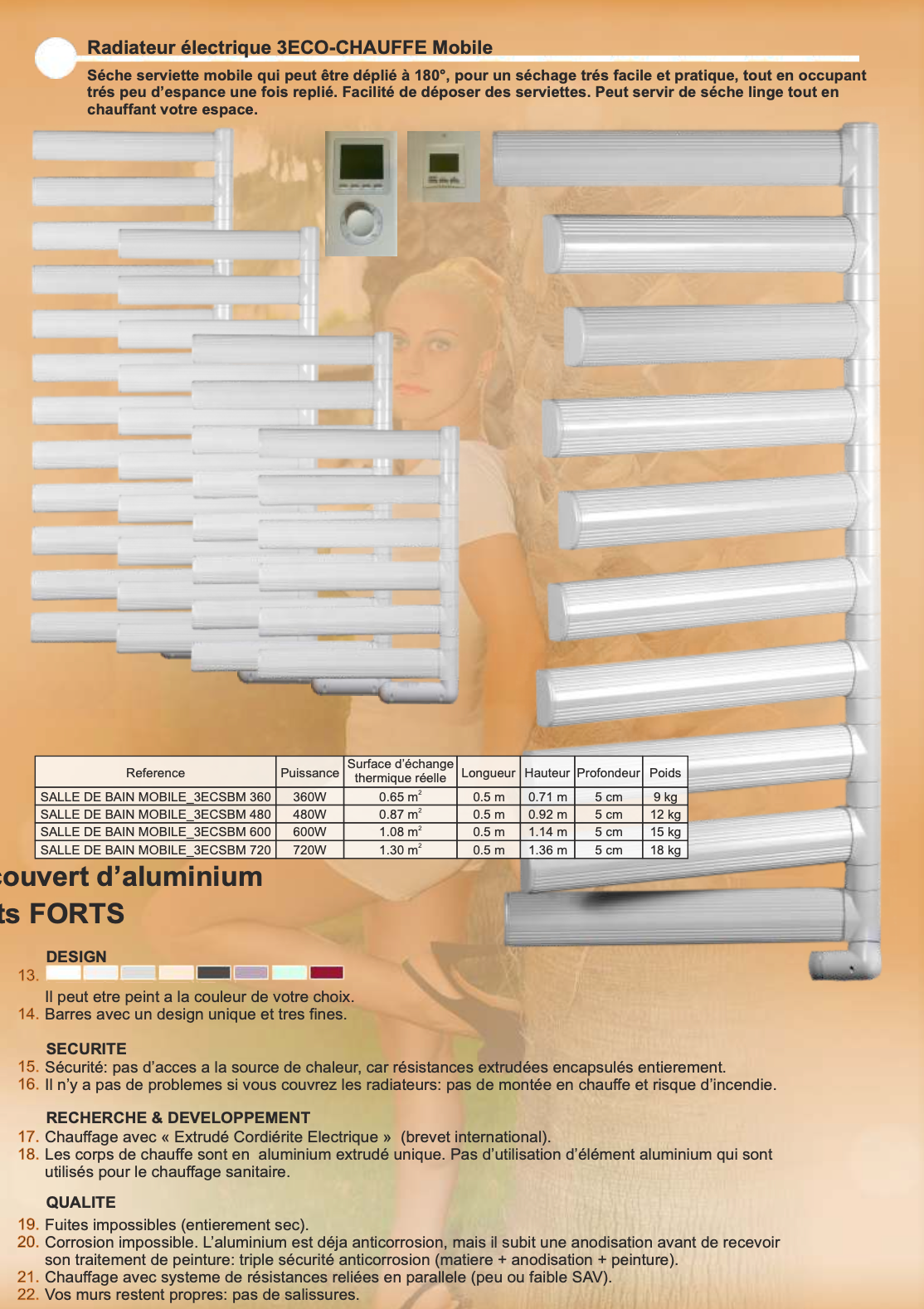 Le sèche serviettes avec bras articulés Ecotherm cumule inertie, rayonnement et convection, afin de chauffer rapidement la salle de bains en diffusant une chaleur douce, constante et homogène. Il permet aussi le séchage rapide de linge ou de serviettes humides.